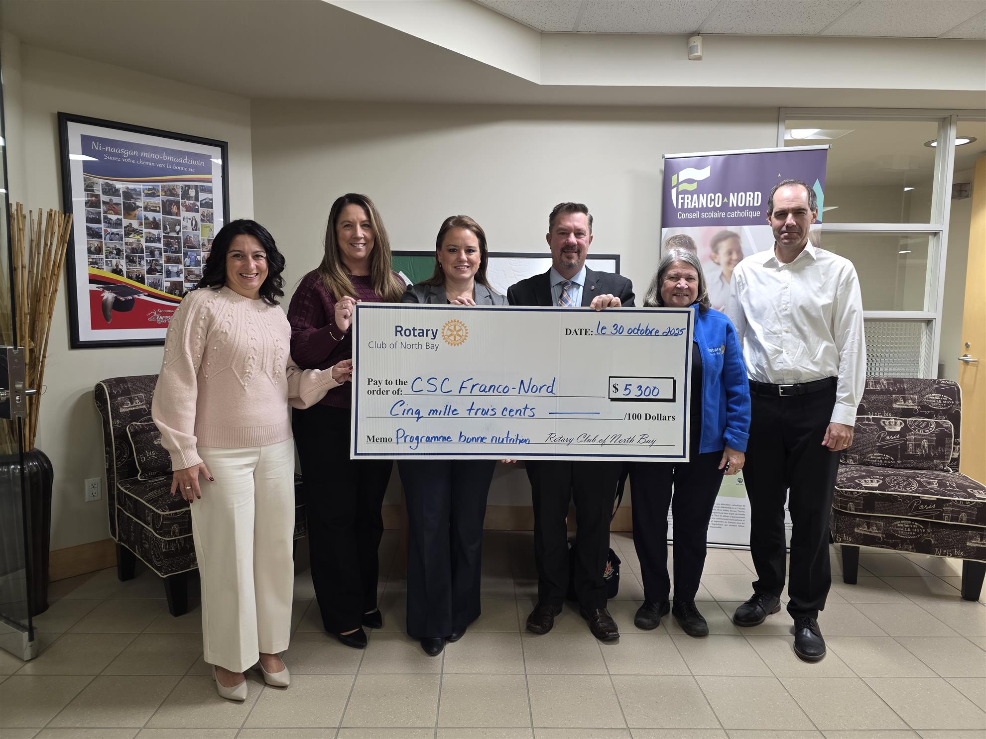The Rotary Club of North Bay has distributed a total of $32,400 to 4 school boards and Nbisiing Secondary School, supporting breakfast and nutrition programs at some 27 schools.
