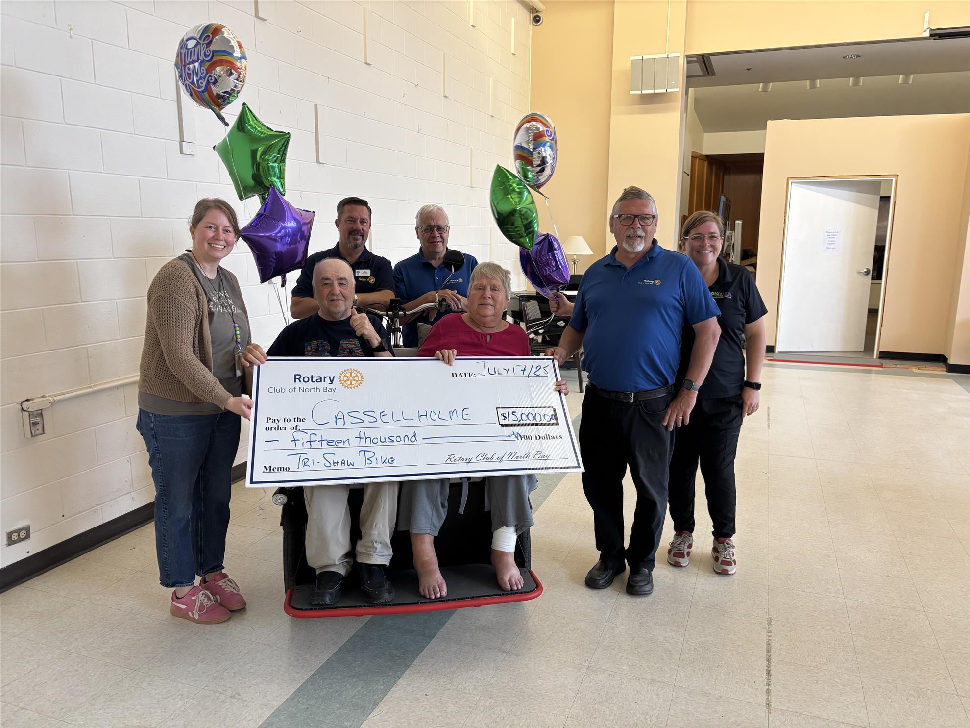 The Rotary Club of North Bay was pleased to participate in Cassellholme's Donor Appreciation Day on July 17th and present a cheque for $15,000 towards the home's recent purchase of a tri-shaw bike. The bike allows the residence to get outdoors and enjoy the park setting in Thompson Park, behind Memorial Gardens.